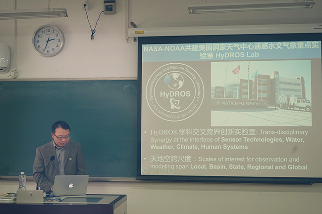 徐宗学教授主持了本次学术报告会,首先向同学们介绍了洪阳教授的学术背景与任职情况,并对洪阳教授的到访表示热烈欢迎。来自清华大学土木水利小妲己直播 教授洪阳本科毕业于北京大学地空小妲己直播 ,在美国亚利桑那大学获得水文水资源工程和遥感空间分析双博士学位。洪阳教授曾在美国国家宇航局(NASA)任研究科学家,同时担任美国国家天气中心(National Weather Center)遥感水文气象实验室主任,北京大学地空小妲己直播 遥感所暑期高级访问教授、同济大学土木工程小妲己直播 光华讲座教授。现为清华大学土木水利小妲己直播 水利水电工程系特聘教授,清华大学未来城镇与基础设施研究院副院长,创建清华大学HydroSky遥感水文气象气候实验室,并担任清华大学遥感大数据研究中心首任主任,清华大学-致生联发信息技术股份有限公司物联网遥感大数据联合研究中心主任。洪阳教授在环境要素遥感定量计算、遥感大数据及同化系统集成、全球变化极端气候灾害预报理论及其工程系统应用方面做出了突出贡献。已发表SCI检索论文320余篇,被引7000多次,编写英文学术著作30多部章节、撰写两本英文教科书,开发转让技术系统15套,其理论方法和专利技术已被应用于美国业务化系统中,并通过国际合作应用在非洲、亚洲、欧洲、中国和中南美洲地区。洪阳教授先后荣获众多荣誉,如校董杰出研究奖(Regents Award for Superior Research)、校长讲席教授(Presidential Professorship)、NASA/Goddard空间飞行中心研究突出贡献奖、美国航天局NASA总部“推动和加速NASA科学研究产品社会化重要贡献奖”、美国航天局Robert H. Goddard Awards地球观测计划贡献奖、NASA总部全球降水卫星专家组成就奖(Achievement Award),以及中国水利学会大禹水利科学技术一等奖等。