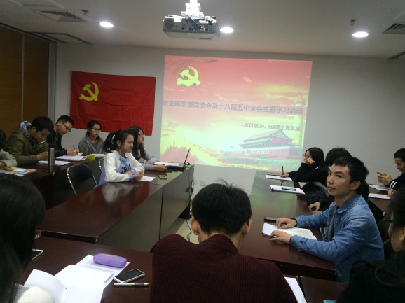 2015年12月5日晚6点,我院15级硕士党支部在京师科技大厦15楼水科院会议室举办了党支部思想交流会及十八届五中全会主题学习活动。