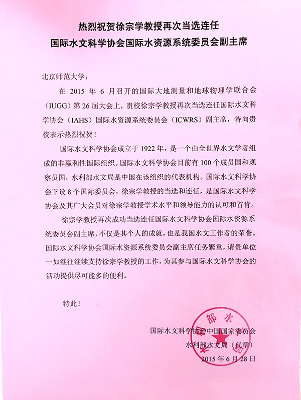我院徐宗学教授再次当选连任国际水文科学协会国际水资源系统委员会副主席