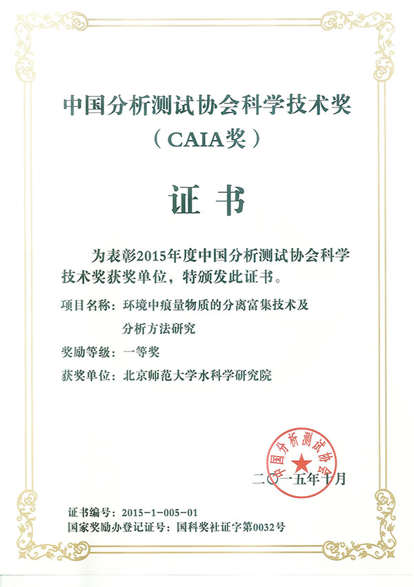 2015年10月27日下午,中国分析测试协会科学技术奖颁奖仪式在国家会议中心隆重举行。由我院教师张波涛、滕彦国、李剑、杨洁、郑蕾和清华大学化学系教师李海芳、林金明等负责研究的“环境中痕量物质的分离富集技术及分析方法研究”成果荣获2015年中国分析测试协会科学技术奖一等奖。