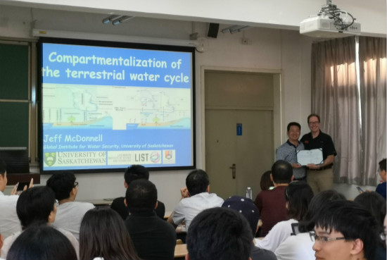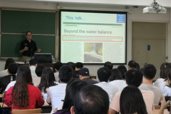随后,Jeffrey McDonnell教授进行了题名为《Compartmentalization of the terrestrial water cycle》的学术报告。作为同位素水文学领域的研究专家,教授从自己在2017年的一篇文章中所得到的结论入手,从水量平衡方程的由来、地质学和生物学对流量的影响等角度向现场观众分享了自己对于陆地水循环的全新且深入的认识,并提出了对陆地水循环的新展望。紧接着,Jeffrey McDonnell教授的博士生Magali Nehemy作了题名为《How plant water status drive tree water source partitioning》的报告,从同位素水文学的角度分析了植物内生水在树木中的驱动效应。报告全程气氛轻松又引人入胜,观众们不仅听得津津有味,也在报告结束后积极地与教授和博士生交流报告中的问题,分享自己在科研中的见闻。