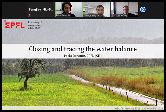Paolo Benettin博士围绕“Closing and tracing the water balance” 主题展开讲座,介绍了以封闭土壤水分平衡为基础的生态水文学研究,以及对土壤水分平衡研究的同位素示踪实验。实验在一个2.5立方米的柳树蒸渗仪上进行,在蒸渗仪顶部注入25mm同位素溶液,并通过土壤水、底部排水和植物木质部对其追踪43天,然后,应用这些实验所得数据量化标记灌溉水被植物吸收以及下渗的过程。来自北京师范大学、清华大学、北京林业大学以及萨斯喀彻温大学、苏黎世大学、圣路易斯国立大学等多所院校的近六十位专家教授、硕博士研究生聆听了本次讲座,会后Paolo Benettin博士还就大家关心的问题开展了交流讨论。